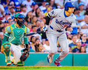 Boston MA - July 25 Shohei Ohtani (17) of the Los Angeles Dodgers watching the flight of his single against the Boston Red Sox during the third inning MLB action at Fenway Park on Friday, July 25, 2025. Photographer: Matthew J. Lee
